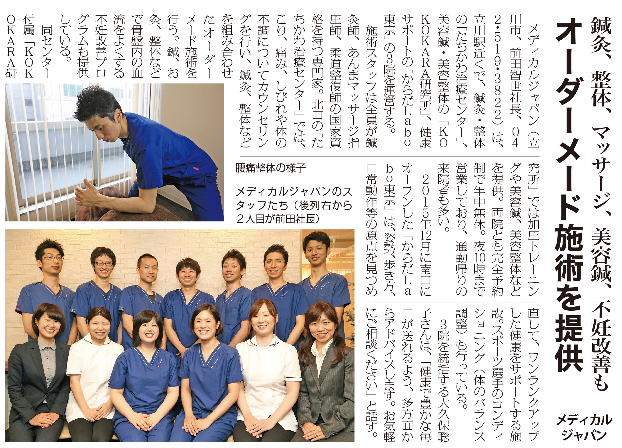 メディカルジャパンとの提携は、前任の医院から含め7年目を迎え、彼らの素晴らしいところは、コメディカルの一員として、国家資格者が地域貢献を見据え、その上でマッサージや鍼灸を実践しているところであり、患者様一人一人の症状や病状に合わせた治療を実践しているところでもあります。